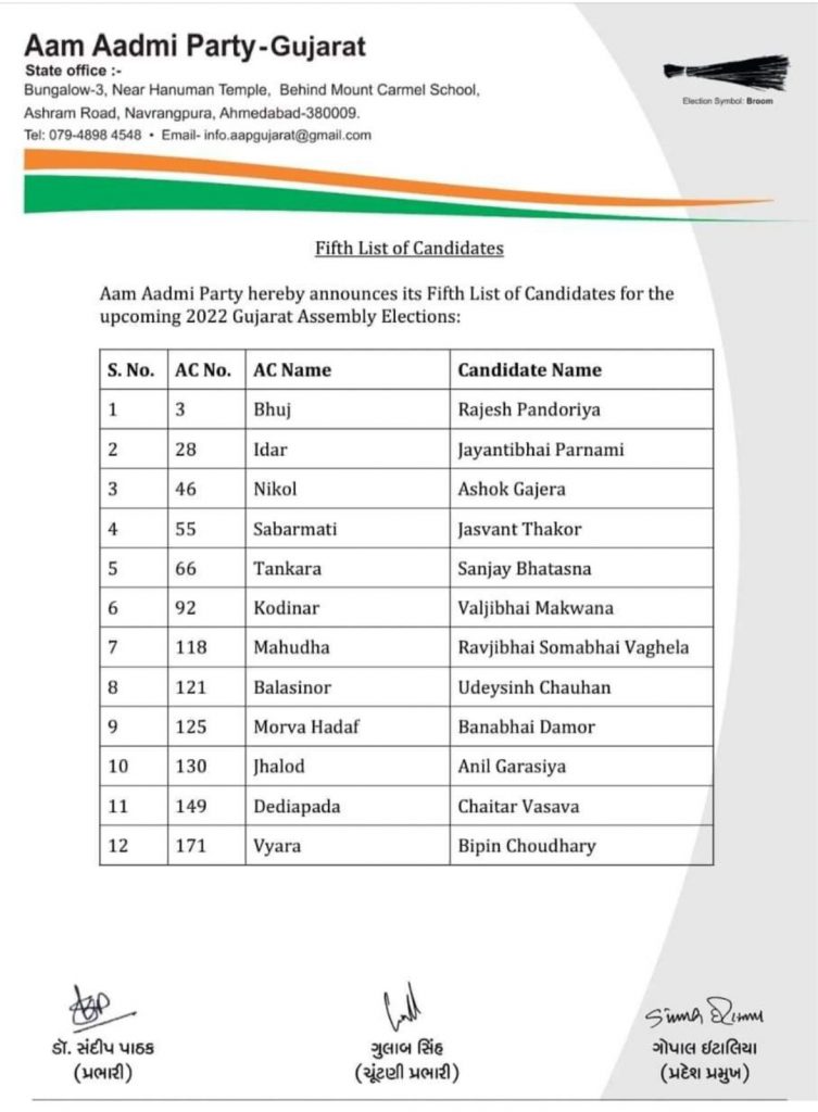 ગુજરાત વિધાનસભાની ચૂંટણીના મહિનાઓ પહેલા ઉમેદવારોનુ લિસ્ટ બહાર પાડવાની આમ આદમી પાર્ટીએ નવો ચીલો ચાતર્યો છે. મતદારો ચૂંટણી પહેલા જ ઉમેદવારોને જાણે અને તેમને ઓળખ તે માટે આમ આદમી પાર્ટી ઉમેદવારોનું લિસ્ટ વહેલા જાહેર કરે છે. ત્યારે આપ પાર્ટીએ આજે ઉમેદવારોનું પાંચમુ લિસ્ટ જાહેર કર્યું છે. આમ આદમી પાર્ટીએ ગુજરાત વિધાનસભાની ચૂંટણીના વધુ 12 ઉમેદવારોનુ લિસ્ટ જાહેર કર્યું છે. આપના પ્રદેશ અધ્યક્ષ ગોપાલ ઈટાલિયાએ પ્રેસ કોન્ફરન્સ કરીને નામની જાહેરાત કરી છે. ઉલ્લેખનીય છે કે, અત્યાર સુધીમાં પાર્ટીએ કુલ 53 ઉમેદવારના નામ જાહેર કર્યા છે.