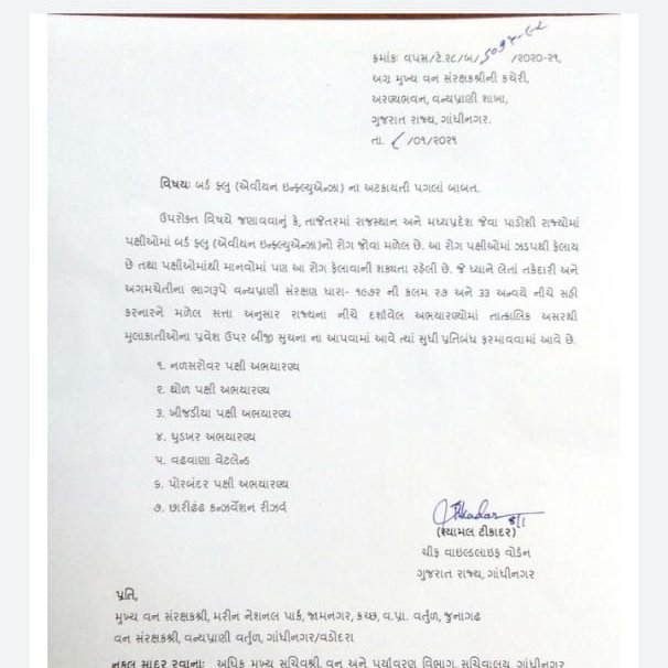 બર્ડફ્લુના અટકાયતી પગલાંને લઈ ગુજરાત વન વિભાગ નો નિર્ણય…