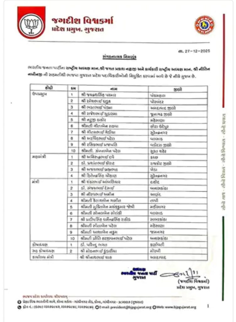 BJP ભારતીય જનતા પાર્ટી, ગુજરાત પ્રદેશ સંગઠનમાં વ્યાપક ફેરફાર કરતા પ્રદેશ અધ્યક્ષ જગદીશ વિશ્વકર્માના નેતૃત્વ હેઠળ નવી ટીમની જાહેરાત કરવામાં આવી છે. 27 ડિસેમ્બર 2025ના રોજ જાહેર થયેલી સંગઠનાત્મક નિમણૂક મુજબ પ્રદેશ ઉપાધ્યક્ષ, મહામંત્રી, મંત્રી, કોષાધ્યક્ષ તેમજ વિવિધ મોરચાના પ્રમુખોની નિમણૂક કરાઈ છે.