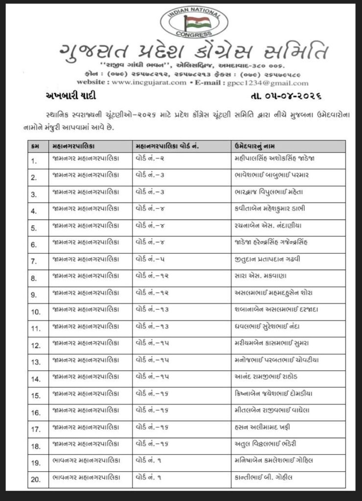 Election : સ્થાનિક સ્વરાજ્યની ચૂંટણી: કોંગ્રેસની પ્રથમ યાદી જાહેર, 7 મનપા માટે 243 ઉમેદવારોને ટિકિટ