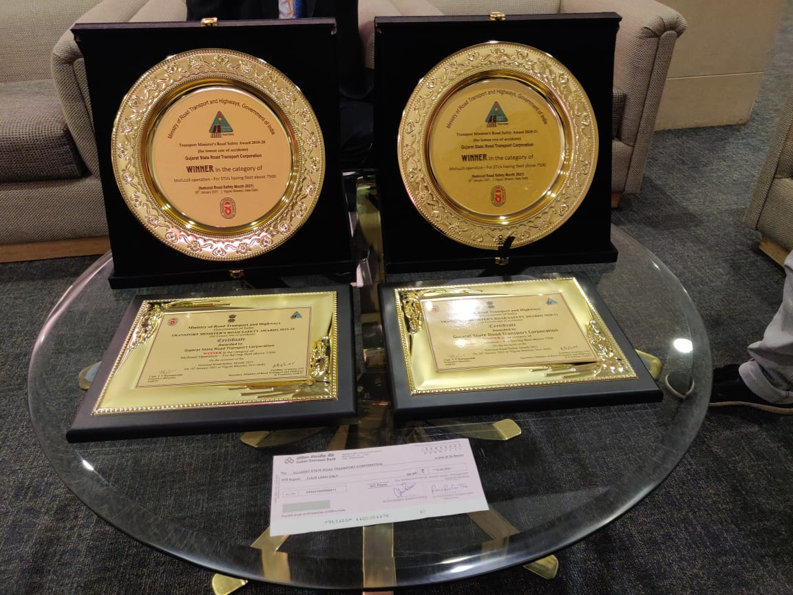 ગુજરાત એસ.ટી.ને દેશભરમાં સૌથી ઓછા અકસ્માત બદલ ટ્રાન્સપોર્ટ મિનીસ્ટર્સ રોડ સેફટી એવોર્ડ-ર૦૧૯-૨૦ અને ૨૦૨૦-૨૧નું સન્માન નવી દિલ્હીમાં અર્પણ થયું