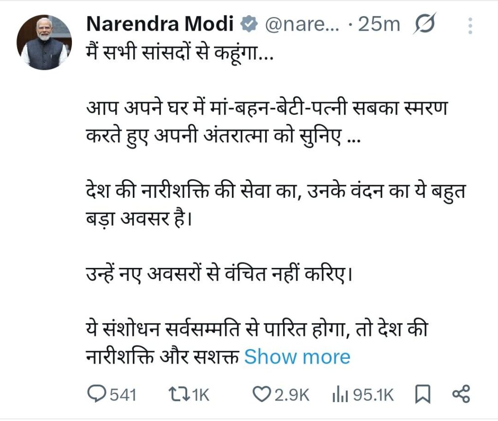 Narendra Modiની અપીલ: સંવેદનશીલતા સાથે નિર્ણય લઈ મહિલા અનામતના સમર્થનમાં મતદાન કરો