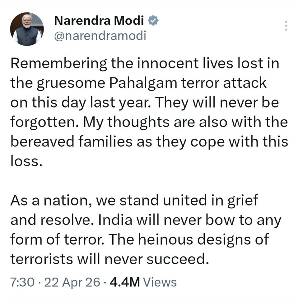 વડાપ્રધાને સોશિયલ મીડિયા પ્લેટફોર્મ ‘X’ પર પોસ્ટ કરતા લખ્યું કે, “ગયા વર્ષે આજના દિવસે પહલગામમાં થયેલા ભયાનક આતંકી હુમલામાં જીવ ગુમાવનારા નિર્દોષ નાગરિકોને આપણે ક્યારેય ભૂલીશું નહીં. આખો દેશ શોકમગ્ન પરિવારોની સાથે અડીખમ ઊભો છે. આતંકવાદીઓના નાપાક ઈરાદાઓ ક્યારેય સફળ થશે નહીં.”